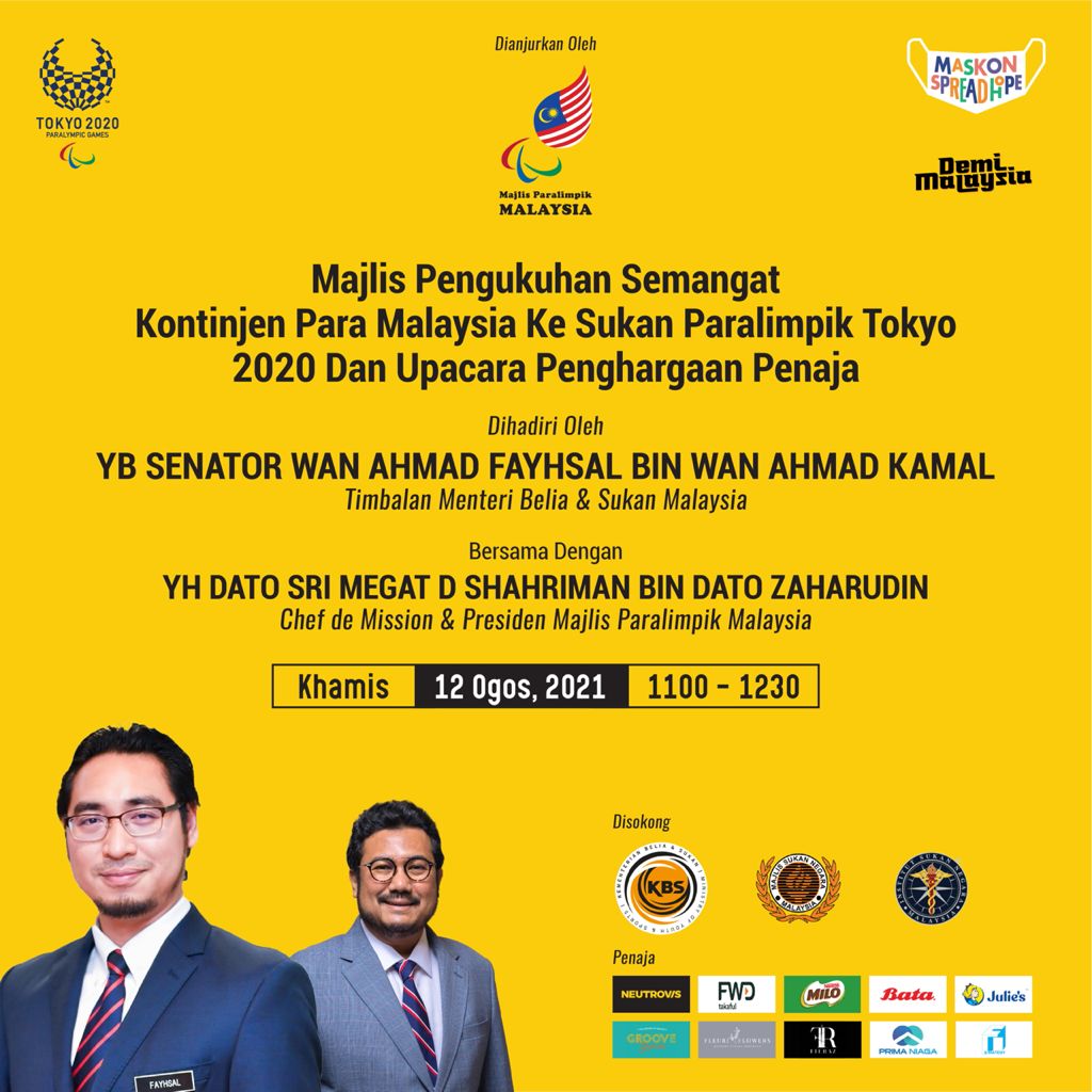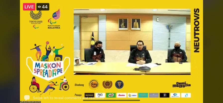 Paralympic Council of Malaysia (PCM) held an online event “MALAYSIAN PARA TEAM SPIRIT STRENGTHENING CEREMONY FOR TOKYO 2020 PARALYMPIC GAMES & SPONSOR APPRECIATION CEREMONY and briefed the games by Chef de Mission (CdM) & President of PCM, YH Dato’ Sri Megat D Shahriman Bin Dato’ Zaharudin, the message of YB Senator Tuan Wan Ahmad Fayhsal Bin Wan Ahmad Kamal, Deputy Minister of Youth and Sports Malaysia and officially announced Rakan Para Games which assisted the Malaysian Para Team and was followed by a press conference.